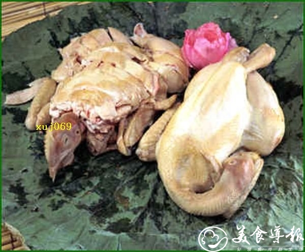 2.荷叶洗净用沸水烫一下,包严鸡体,再用玻璃纸包在荷叶上,并用麻线一根绕捆好,外面糊上调好的黄泥巴,约3厘米厚,放在小火上慢慢烤5至6小时,待泥巴干酥时取出,轻轻破掉泥层。