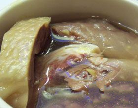 4.另取净锅放1000克鲜汤,加料酒、盐、味精、葱(切段)、姜(切片)和鸡块,用大火烧沸后,撇去浮沫;