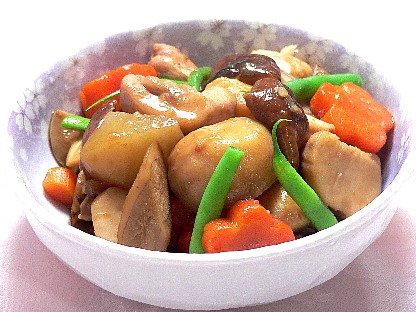 鸡肉200公克,蒟蒻120公克,牛蒡1/2条,里芋4~6个,红萝卜80公克,莲藕80公克,熟竹笋80公克,香菇4朵,皇帝豆20公克,麻油1大匙,铝箔纸1张,出汁300cc,酒1大匙,酱油2大匙,味醂2大匙,砂糖2大匙