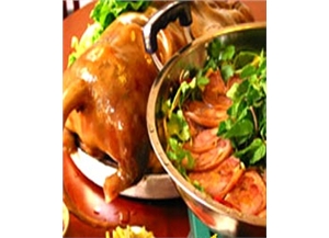 6、锅内掺入清水,放鸡肉、肘子、葱姜,用武火烧沸,打净浮沫,火煮至肉熟时,下入狗肉、响把。