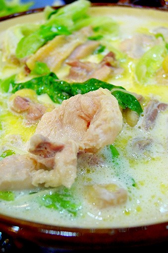 4.将牛奶煮滚,放入红萝卜及香菇,煮约3分钟后,再将草虾、蛤蜊、花枝、鱼片加入煮熟,最后放入蒜苗、盐及少许米酒,增加风味即可。