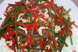 1、锅内加水烧沸后倒入红椒丝焯一下起锅沥干水分。