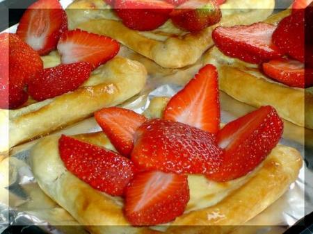 2.把pate切成四份,然后四周卷一下,卷成四方形,往里面浇creme,入烤箱,200度,烤多久我没计时间,烤成颜色差不多了就行了摆上草莓.再刷层蜂蜜。