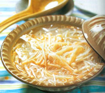 金针菇去杂,洗净,切段。将淀粉加水调匀,入锅烧沸,放入鳝丝,加酱油、精盐、黄酒,烧至鳝丝半熟时投入金针菇及生姜丝,翻拌至鳝丝熟透,起锅盛入盘中。炒锅上大火,放油烧热,投入拍碎的蒜瓣爆香,将其浇在鳝丝上即成。