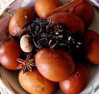 主料:鸡蛋1000克,茶叶25克,花椒2克,大料5克,桂皮5克,小茴香3克,精盐10克,酱油50克,葱10克,姜5克。