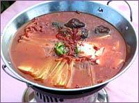 3.锅仔板鸭:在锅仔里注上鲜肉骨头汤,下年糕块、菇花和熟板鸭(蒸板鸭的盘里会有熟板鸭滴下的油,为了身体健康就不要放进汤里去),加上香菜叶,点燃锅仔底的酒精。