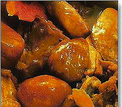 3.烧热锅,下油,烧至七成熟时,将鸡块过一下油,鸡皮呈金黄色时捞起,倒去余油。然后把栗子、鸡块倒在锅中,加入酒、酱油、盐、糖和适量的汤(刚好漫过食材),盖上锅盖在大火上煮滚后,用小火焖酥。