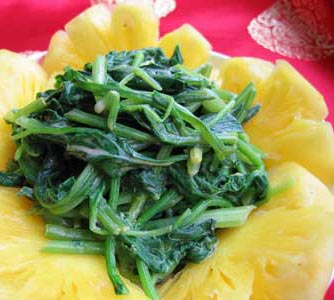 主料:菠菜,蒜,芝麻酱,盐,鸡精,香油,菠萝(装饰用)。