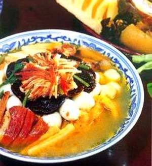 鸡肉,海参,熟白鸡肉,鱼肉,熟火腿,油发鱼肚,鱿鱼,水发腐竹,干贝,冬菇,玉兰片适量