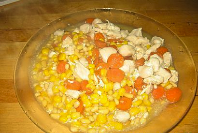 玉米,松仁,鸡块,胡萝卜,蛋清,盐,鸡精,菱粉
