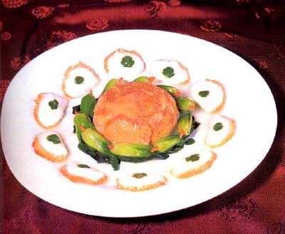 3、炒勺上火,用高汤、鲍汁、盐、味精、糖对汁,淀粉勾芡,浇在上边即可。