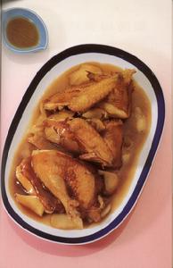 4)烧热1汤匙油,下酸姜略炒1分钟,加芡汁料煮滚,淋于春鸡上即可。