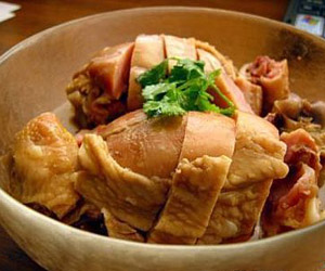 2、烧好半锅开水,放入葱结、姜片后,将鸡放入锅内白煮,直到用筷子可穿透鸡肉时,取出鸡。
