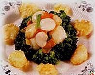 扇贝400克,北极贝、虾肉、银鳕鱼肉、灵芝菇、面捞各100克,西芹、芥兰各150克,香菜粒、面包糠各25克,盐、蚝油各适量