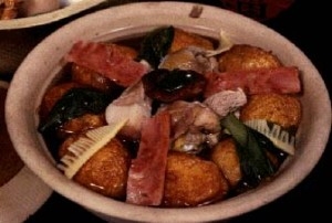1、猪肘肉、带骨雏鸡肉均剁成3.3厘米见方的块,放入开水锅中氽过,取出放入砂锅内。