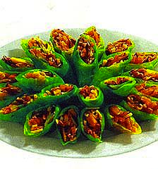 7)抹上一层鸡蛋糊,撤上香菜、蛋糕末,入笼蒸2分钟取出;
