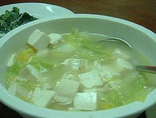 主料:泰安豆腐150克,白菜心100克,鲜汤500克,精盐4克,味精1克,葱末,姜末各1克,鸡油5克,熟猪油20克。