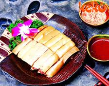 4、晾干表皮,浇上熟花生油,斩成小块,盛入碟中,摆成鸡形。吃时佐以姜茸、葱丝
