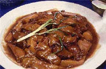 5)净炒锅加花生油少许,放中火上烧六成热(约150℃),加葱段、姜片、花椒炸至呈金黄色时捞出,倒入鸭锅内;鸭上面扣上盘子,用小火煨1小时左右,揭去盘子,提出锅垫,用平盘托着扣入大盘内,揭去锅垫;锅内汁用淀粉勾流水芡,浇在鸭方上即成;
