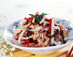 4.猪肉洗净,切成4厘米长的细丝,用湿淀粉10克(淀粉8加水)抓匀上浆;