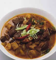 (2)热油锅爆香姜、蒜、辣椒、葱,再入花椒粒、辣豆瓣酱拌炒,接着加水1又1/2杯煮滚,放入鸭血、大肠、酸菜片及调味料。
