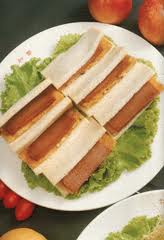 (3)将蜜汁火腿蒸熟后,再把起酥片2片及火腿片1片夹入土司中,依序完成8份即可。