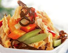 7.将腐竹段、莴苣片、肉片、胡萝卜片、冬笋片、木耳装入盆内,加入精盐、味精,浇上热花椒油拌匀,装盘即成。