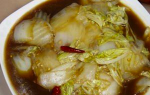 2.醋溜白菜:1、把大白菜拦腰切,取出白菜帮子,切片 2、锅内放油,先把姜片和干辣椒爆香 3、放入白菜帮子翻炒 4、加少许清水,再调入醋、盐、生抽、一点白糖 5、白菜炒至软身出汁即可