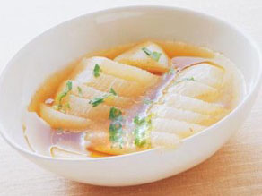 1、萝卜洗净,对剖成两半,置入盘内,入锅蒸15分钟;香菜择洗干净,切末。