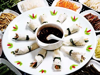 5、春卷皮中放入各种素菜丝包成上大下小的兜形,放入酥黄豆,浇淋兑好的辣椒汁即成。