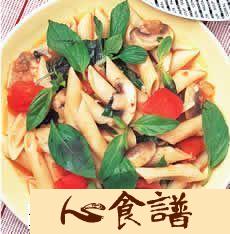 主料:斜管�200公克新鲜蕃茄150公克蘑菇100公克九层塔叶30公克大蒜2瓣洋葱1/4个高汤200公克橄�油50公克冰糖10公克帕梅善起司粉20公克盐及胡椒粉各少许