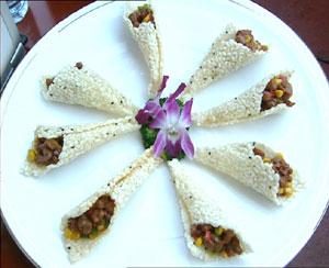 2、牛肉加盐、料酒、高汤精、水淀粉腌制片刻,再过油滑一下取出,留底油,下葱、姜煸香,放入牛肉、玉米粒、青红椒翻炒,加盐、高汤精、料酒、蚝油、酱油调味,勾少许芡出锅,逐个装入做好的锅巴卷中即可食用。