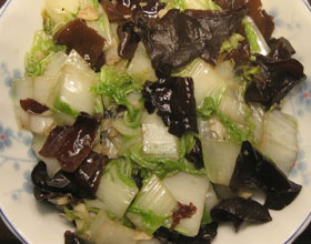 2.锅架旺火上,放油烧至七八成热时将洋白菜下入,快速煸炒一分钟见菜变软呈白玉色,下木耳同炒几下,随即倒入芡汁,见汤汁转稠,颠翻均匀,淋入少许明油即成。