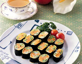 5.将切成适当大小的海苔(紫菜)分成两半,放上半量的白饭,分别放入制好的材料,再将海苔卷紧,切成易食用的大小即成。