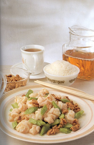 主料:核桃肉50克,中虾400克,芦笋粒,红萝卜粒,蒜蓉,酒,精盐,糖,生粉,蛋白,油,芝麻油,胡椒粉,蚝油各适量。