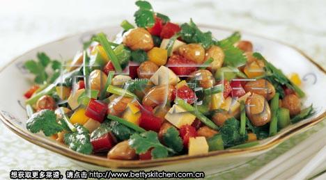 6、先把晾凉的炸花生、菜椒粒、香葱段、香菜段在盘中摆好,临吃前浇上调味汁拌匀即可。