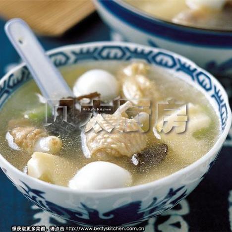 净仔鸡1只,鹌鹑蛋10枚,笋200g,干木耳10g,黄瓜1根,老姜3片,大蒜片5g,料酒1汤匙15ml,鸡精1茶匙5g,高汤500ml,盐1茶匙5g,油2汤匙30ml