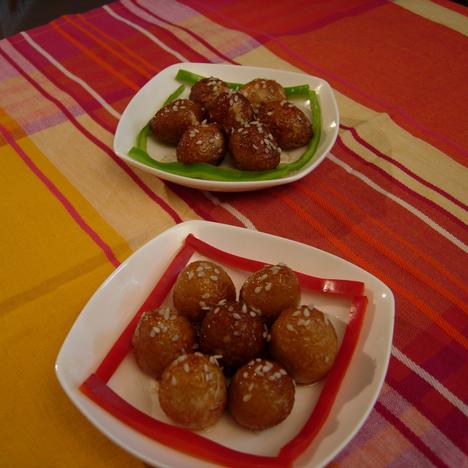 4、鹌鹑蛋表面,撒些白芝麻,盘边周围放上青椒、红椒丝作点缀即可。