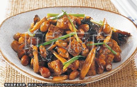 1。香菇、木耳分别放入热水中浸泡至全部发好,剪去根蒂剪去根蒂,切小块备用。干烤麸也浸入冷水中泡10分钟。泡香菇的水沉淀留用。如果用干花生仁,放入沸水中,用小火煮约10分钟,然后取出沥干水分待用。