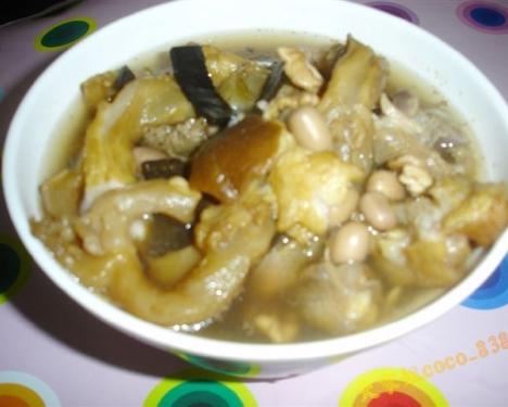 新鲜猪脚筋400克,杜仲50克,花生,合桃各50克,陈皮1/2个,蜜枣2个