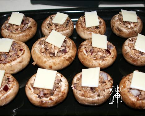 4、烤盘抹油(色拉油或者橄榄油都行),把口蘑帽子头向下放在盘子上,把3的馅料均匀的堆放在小帽子里。