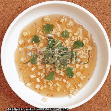 蒜茸2汤匙(30g),香菜碎1茶匙(5g),大葱花1茶匙(5g),熟芝麻2茶匙(10g),盐1/2茶匙(3g),花椒油1茶匙(5ml),香油1汤匙(15ml),水1汤匙(15ml)