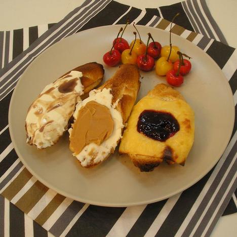 法棍,牛奶早餐奶酪,巧克力酱,花生酱,黑加仑果酱