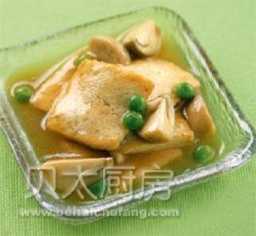 3、再起锅,加热余下的1汤匙油,倒入草菇翻炒,加入2汤匙水,加热23分钟至草菇成熟,再加入豆腐及豌豆,放酱油和盐调味,用水淀粉勾芡,烧开即成。