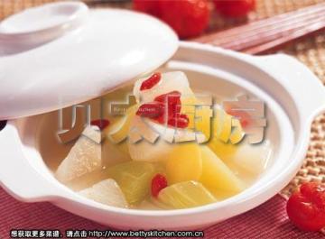 砂煲置火上,倒入油,中火烧至七成热,放入老姜片爆香,然后放入汆烫过的白萝卜块和枸杞子,加入鸡汤、料酒,大火煮开后,转小火煮25分钟。