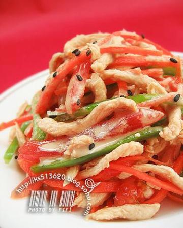 原料:鸡胸肉,番茄(稍硬一些的),青辣椒,胡萝卜,柠檬,调料:盐,白糖,芝麻酱,酱油,黑芝麻