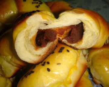 材料:(可以根据自己做面包的量酌量增减),高筋面粉150克,糖30克,盐5克,橄榄油15克,(色拉油也可以,黄油做好啦,会有浓郁的香味),酵母3克,牛奶20克,豆沙50克,(夹馅用,也可用椰蓉,肉松)