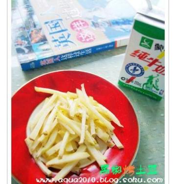 1、土豆去皮.切成粗条状(个人觉得.土豆条切的不要太厚,因为太厚了.水分难烤干;薄些的话.土豆表面被烤干.里面的水分被烤了很多.口感带点韧劲.带点脆感.很好吃~油的话.如果家里有橄榄油的话.就用橄榄油.热量更低.黑胡椒碎没有的话.就用黑胡椒粉代替)