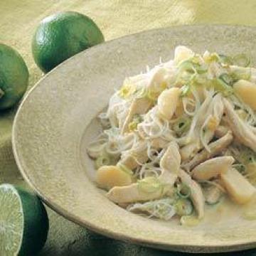 米粉125克,去骨去皮鸡脯500克,新鲜生姜25克,新鲜青辣椒1根,大蒜2瓣,莱姆(青柠)3个,罐装荸荠(马蹄)225克,花生油1汤匙,糖1/2茶匙,大葱5根,椰奶125毫升,泰式鱼露或酱油少许