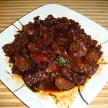 牛肉,干辣椒、八角、桂皮少许,姜、葱、老抽、料酒、白糖适量
